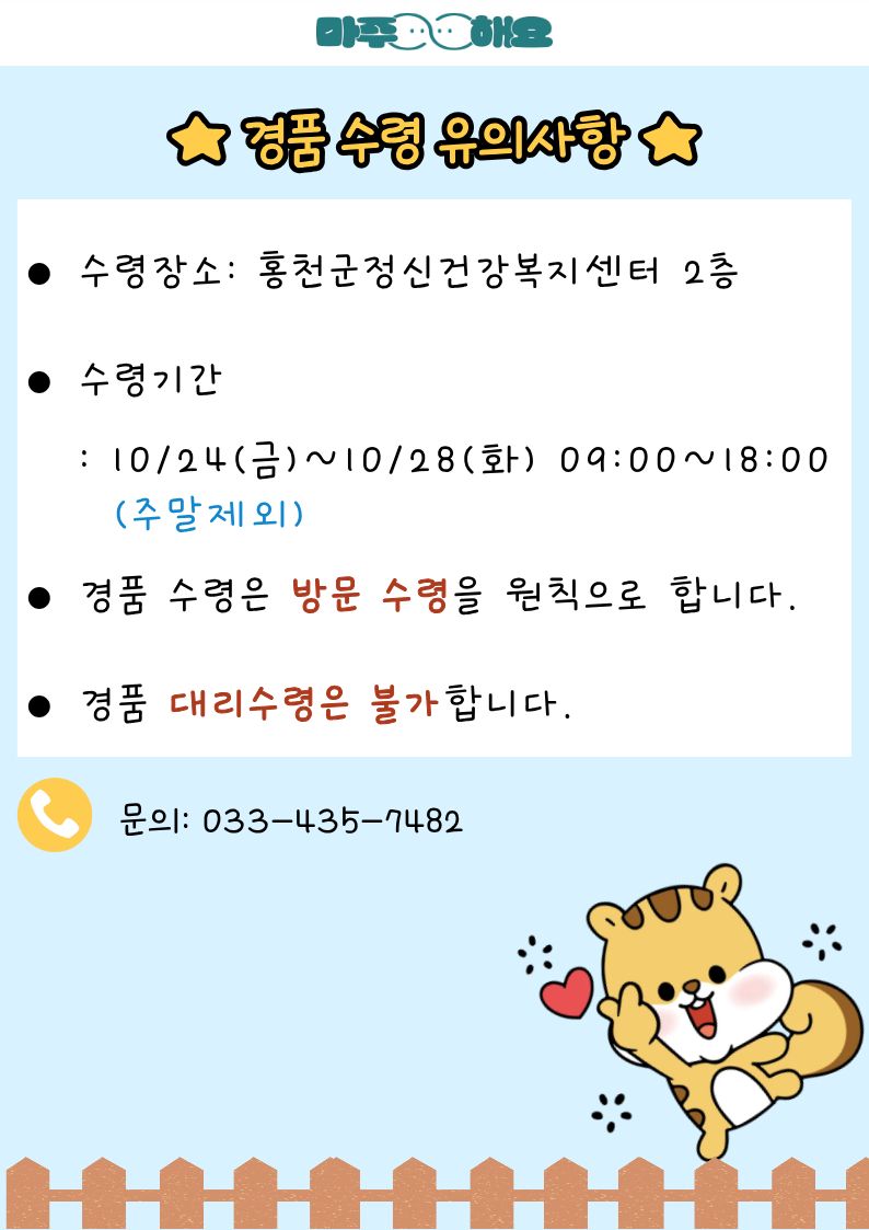 당첨자를 발표하겠습니다. 당첨되신 분들 모두 축하드립니다. ● 수령장소: 홍천군정신건강복지센터 2층 ● 수령기간: 10/24(금) ~ 10/28(화) 09:00~18:00 (주말제외) ※ 경품 수령은 홍천군정신건강복지센터 방문 수령을 원칙으로 합니다. ※ 경품 대리수령은 불가합니다.  |