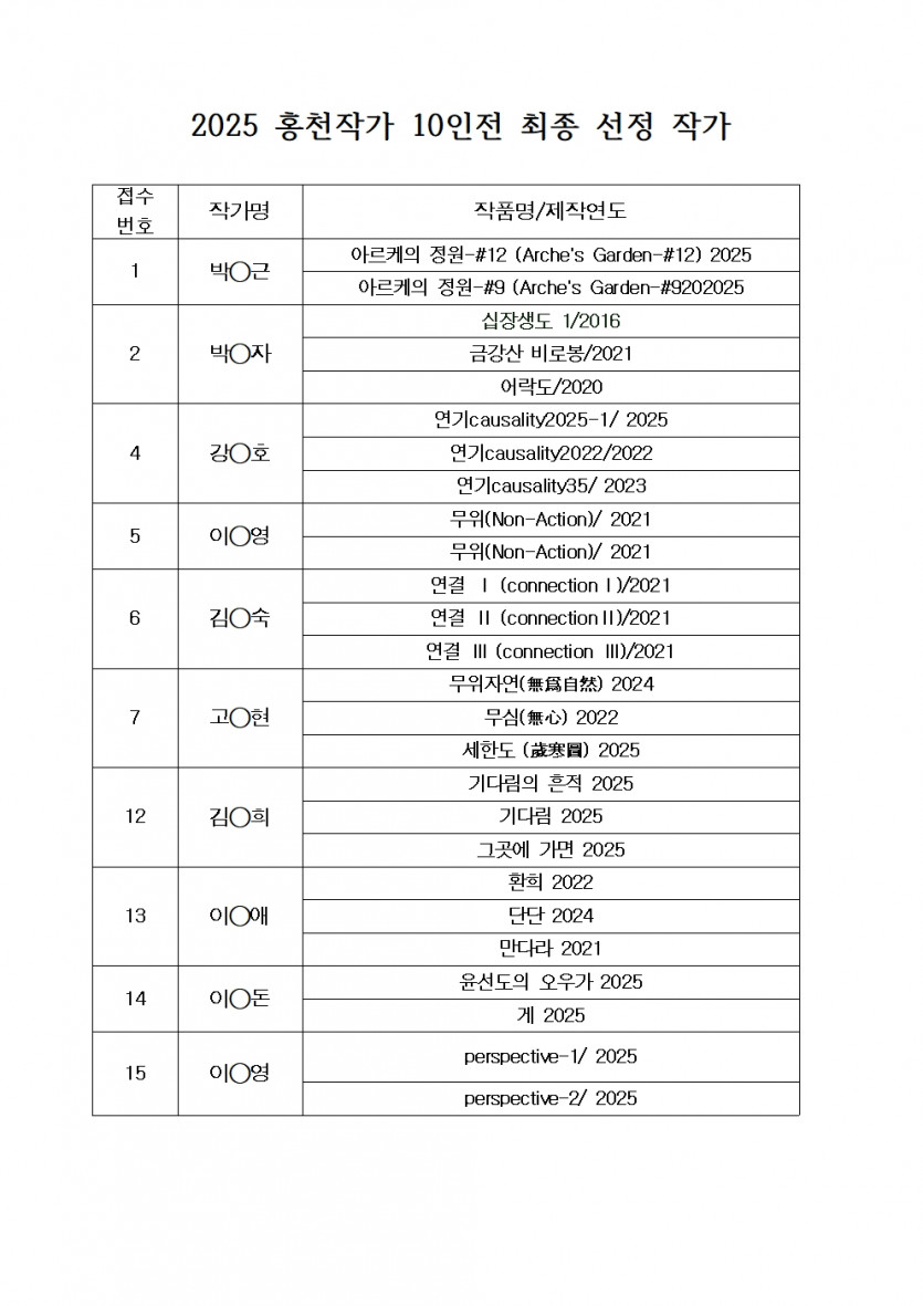 2025 홍천작가 10인전 선정 작가 발표 목록 본문 ※ 2025 홍천작가 10인전 선정 작가를 발표합니다.홍천작가 10인전 에 출품해주신 모든 작가님들께 감사의 인사를드립니다.선정되신 작가 분들께는 별도로 연락드릴 예정입니다. 다음글2025 홍천작가 10인전 작가 선정 공고 25.07.21