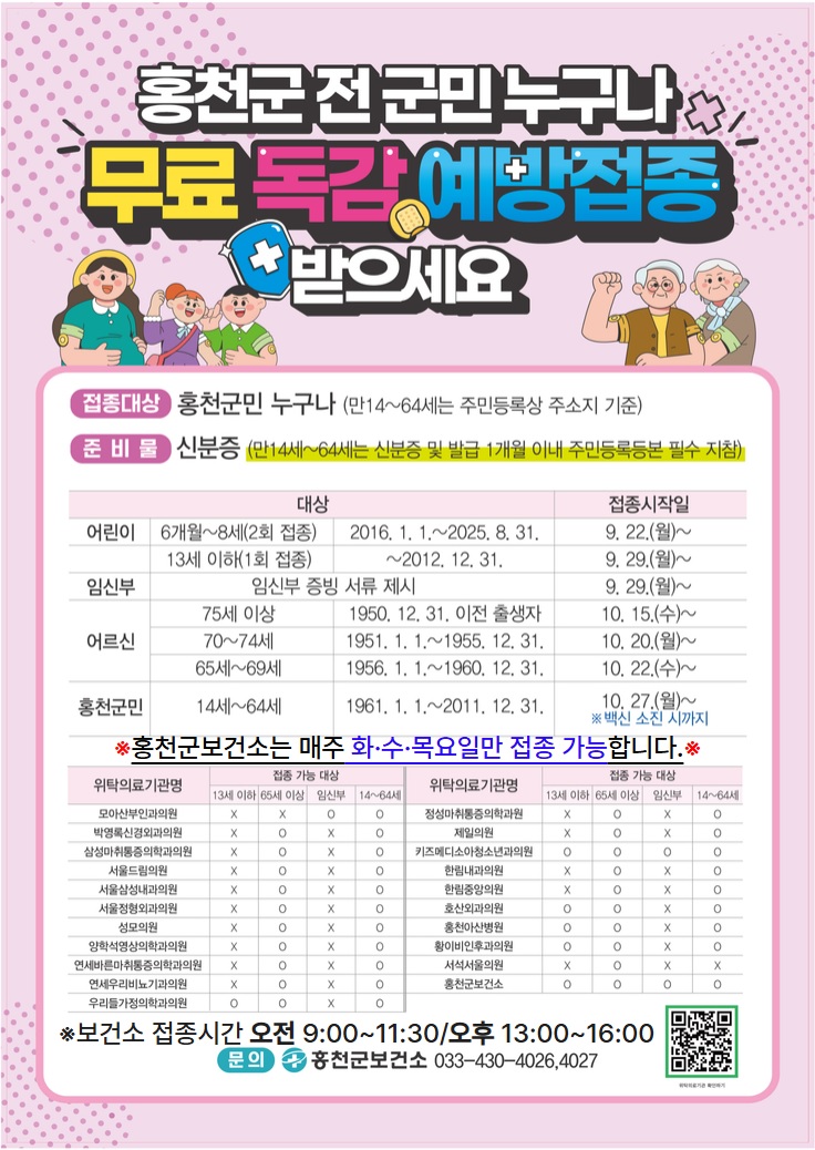 팝업존 누리집 이용정보 팝업존 인쇄 팝업존 검색조건 전체 제목 대체텍스트 검색어 입력 검색 총 팝업 47 페이지 1 / 4 질병을 이길병으로 (인플루엔자) 무료독감예방접종 2025년 청년일자리 근속장려금 3차 대상 모집 홍천중앙시장 옥상 별빛영화제 그리고 야시장 병역이행 응원 글 보내기 문서24 서비스 중단 안내 홍천 농업최고경영자 2026년 육군 상비예비군 (장단기)모집 2025년 강원 단풍 기상 융합서비스 퀴즈이벤트 외국인 유학생 박람회 제10회 홍천 사과 축제 제23회 인산 홍천 명품축제 한우 이전 페이지1234 다음 페이지